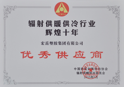 2015年5月15日,中国辐射供暖供冷委员会十周年庆典在北京盛大举行。会上表彰了一批对辐射供暖供冷行业发展作出突出贡献的企业和个人,花体会集团喜获中国辐射供暖供冷行业辉煌十年优秀供应商殊荣,花体会塑胶集团有限公司张思良总经理荣获中国辐射供暖供冷行业功勋奖。