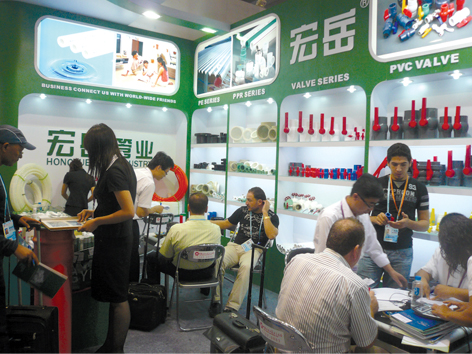 在本届广交会期间,来自欧洲、南美、北美、中东、非洲、东南亚等世界各地的众多客商站在花体会的展位前,拿起精致的花体会MacroAlp系列PPR管材管件,询问不停;更多的客户对花体会齐全的PPR、PVC球阀系列产品包括八角球阀、内螺纹球阀、铜芯球阀、组装阀、蝶阀等纷纷带走样品,购买意向非常明确,另外许多用户在5天展期内在货比多家后,多次来到展位前洽谈购买细节,最终签订合作协议,不但证明了花体会产品的优秀品质得到了客户和市场的检验,同时极大的鼓舞了外贸部所有人员的工作激情和斗志。