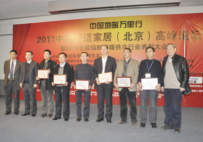 由中国建筑金属结构协会辐射供暖供冷委员会主办的“2010年度辐射供暖供冷行业年度评比活动”圆满结束,并于2011年3月4日在北京举行颁奖典礼,花体会管业凭借多年来在地暖行业的突出贡献及取得的巨大发展成就,被评选为“2010年度全国辐射供暖供冷行业先进集体”,集团公司总经理助理王明科和市场部经理刘汉良由于多年来积极参与地暖行业活动,为推动行业发展及企业建设发挥了重要的作用,被评选为“2010年度辐射供暖供冷行业先进工作者”。同时,秦皇岛花体会建筑安装有限公司荣获“2010年度全国辐射供暖供冷行业优秀施工企业”称号。