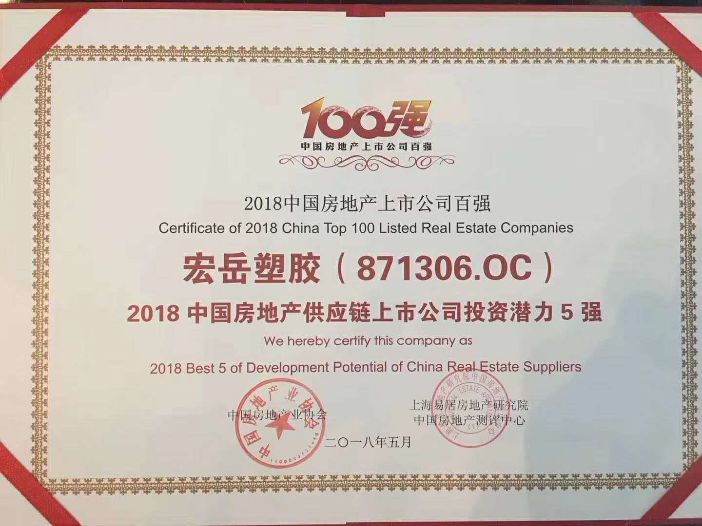 由中国房地产业协会、上海易居房地产研究院中国房地产测评中心联合开展的“2018中国房地产上市公司测评成果发布会暨金融创新高峰论坛”在深圳举行,花体会荣获“2018中国房地产供应链上市公司投资潜力5强”。