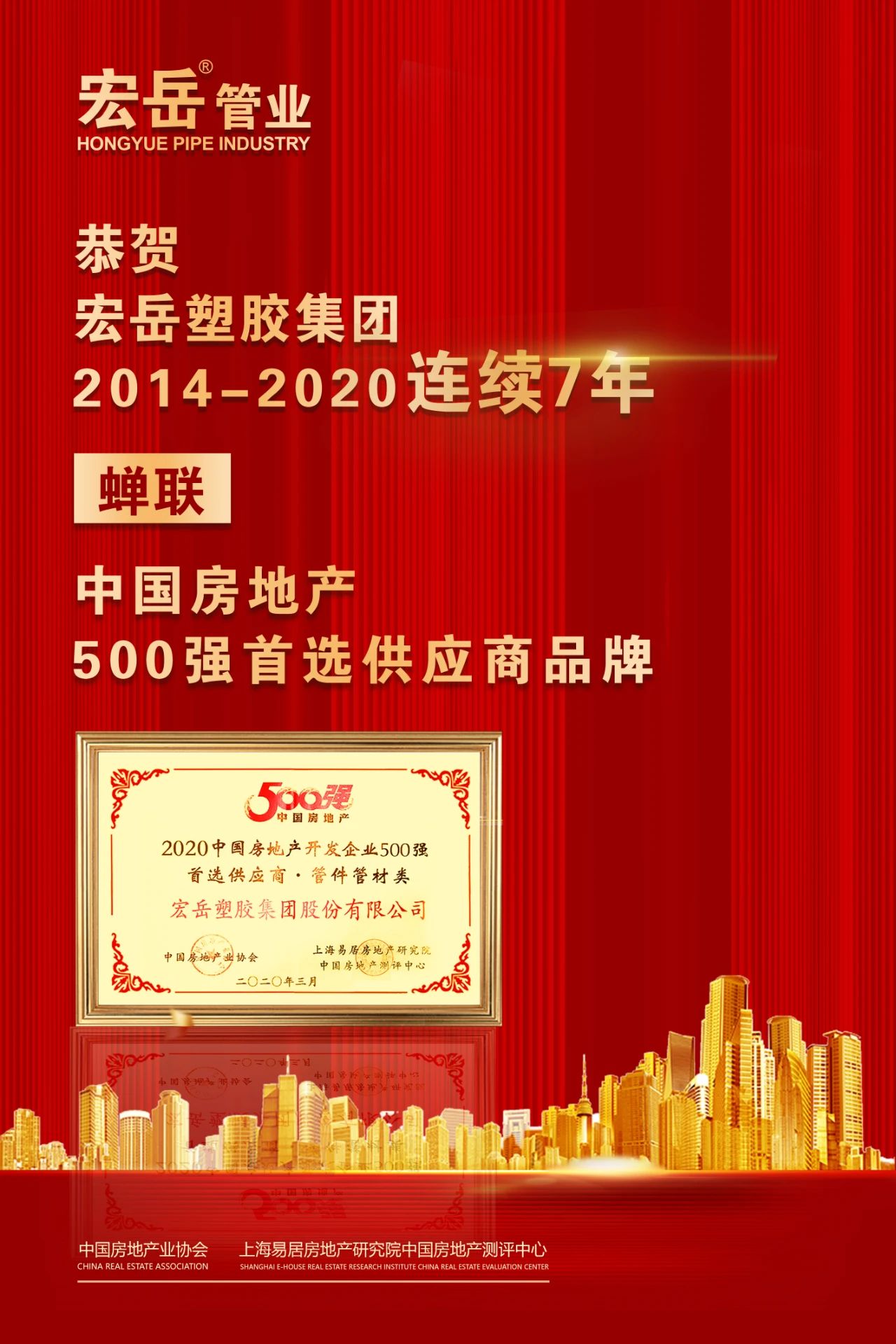 《2020中国房地产开发企业500强测评报告》和《2020中国房地产开发企业500强首选供应商服务商品牌测评报告》同时揭晓。花体会塑胶集团股份有限公司荣获2020年中国房地产开发企业500强首选供应商服务商品牌测评榜单的管件管材类5强。