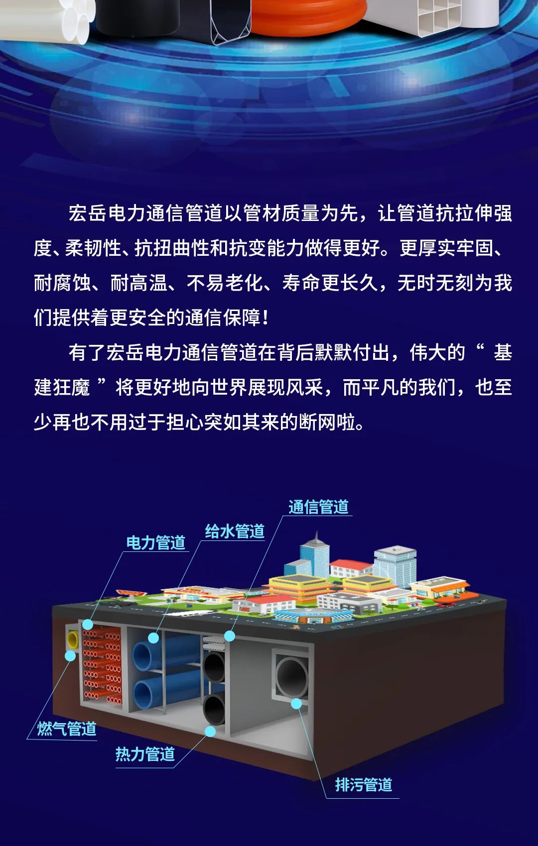 花体会电力通信管道以管材质量为先,让管道抗拉伸强度、柔韧性、抗扭曲性和抗变能力做的更好。更厚实牢固、耐腐蚀、耐高温、不易老化、寿命更长久,无时无刻为花体会提供着更安全的通信保障!